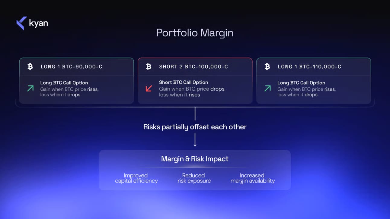 Instead of forcing users to fully collateralize each position in isolation, Kyan evaluates risk across the entire portfolio. Offsetting exposures are recognized, correlated positions are modeled as such, and hedging strategies reduce margin requirements in a meaningful way.